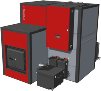 Instalação com duas caldeiras a pellets Fröling PT4 150 kW com sistema de aspiração.